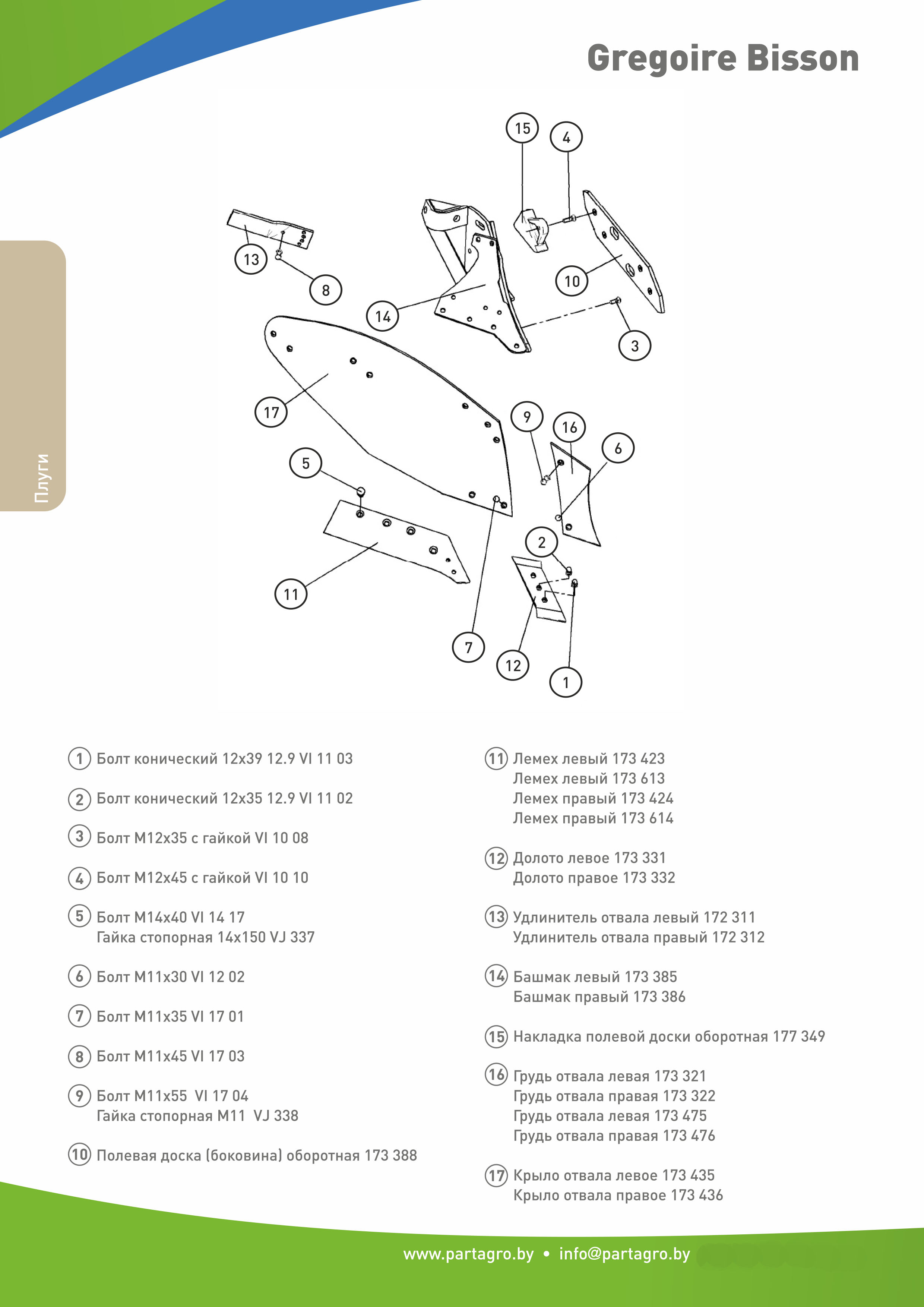 Плуги производства Gregoire Besson - французское качество для профессиональной вспашки любых, даже самых сложных почв. Известны надежностью, точной геометрией и эффективной работой на многокорпусных решениях. Ищете надежные детали для восстановления работоспособности вашего плуга? В нашем каталоге представлен широкий ассортимент запчастей для плугов Gregoire Besson. У нас есть все необходимое для ремонта и обслуживания: от лемехов, отвалов и стоек до дисков, подшипников, крепежа и гидравлических компонентов.